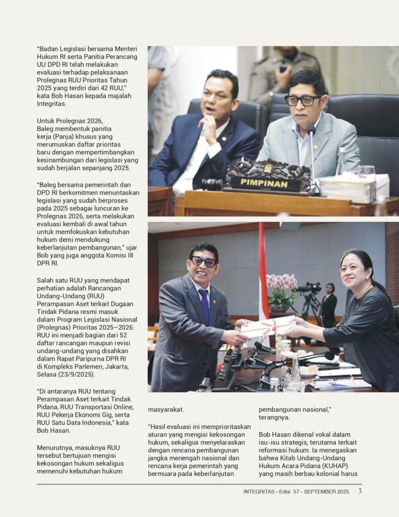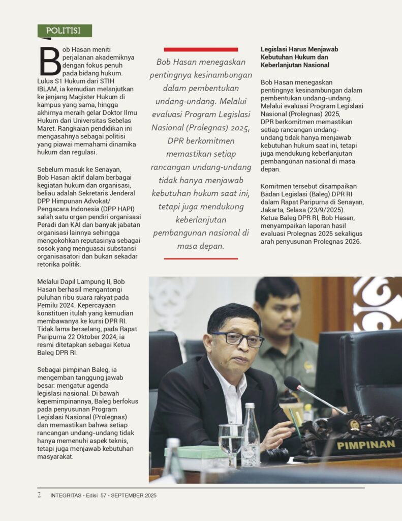 HAPIJABAR.COM, Jakart – Ketua Badan Legislasi (Baleg) DPR RI, Dr. Bob Hasan, S.H., M.H., menegaskan komitmennya membangun legislasi yang berkeadilan dan berpihak pada rakyat. Politisi Partai Gerindra ini dikenal aktif mendorong reformasi hukum serta menekankan pentingnya partisipasi publik dalam setiap proses penyusunan undang-undang.