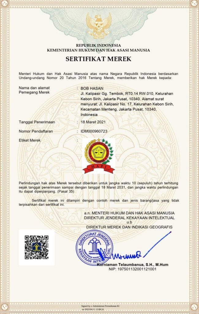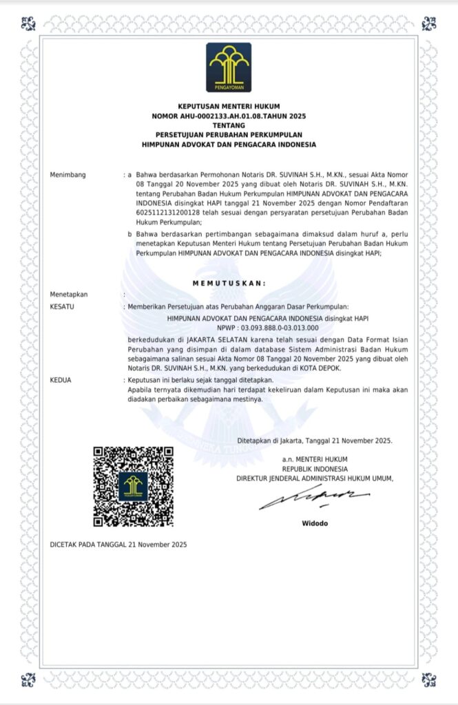 HAPI sebagai Organisasi Advokat yang resmi dan sah yang dituangkan di dalam pasal 32, dan 33 Undang Undang Nomor 18 tahun 2003 tentang Advokat.
